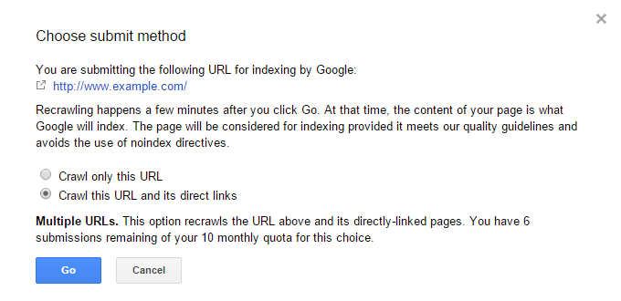 5. After everything checks out fine, use the “Submit to index” feature on the homepage and main categories (using the “Crawl this URL and its direct links” option – you get 10 of these a month) to expedite the indexing of your design and code changes.