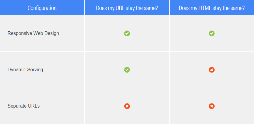 There are different ways to create a mobile website and it’s important to understand the types available from both a design and SEO viewpoint. In their Mobile SEO guide, Google lists three possible mobile configurations that site owners can choose from: Responsive Web Design, Dynamic Serving and Separate URLs.