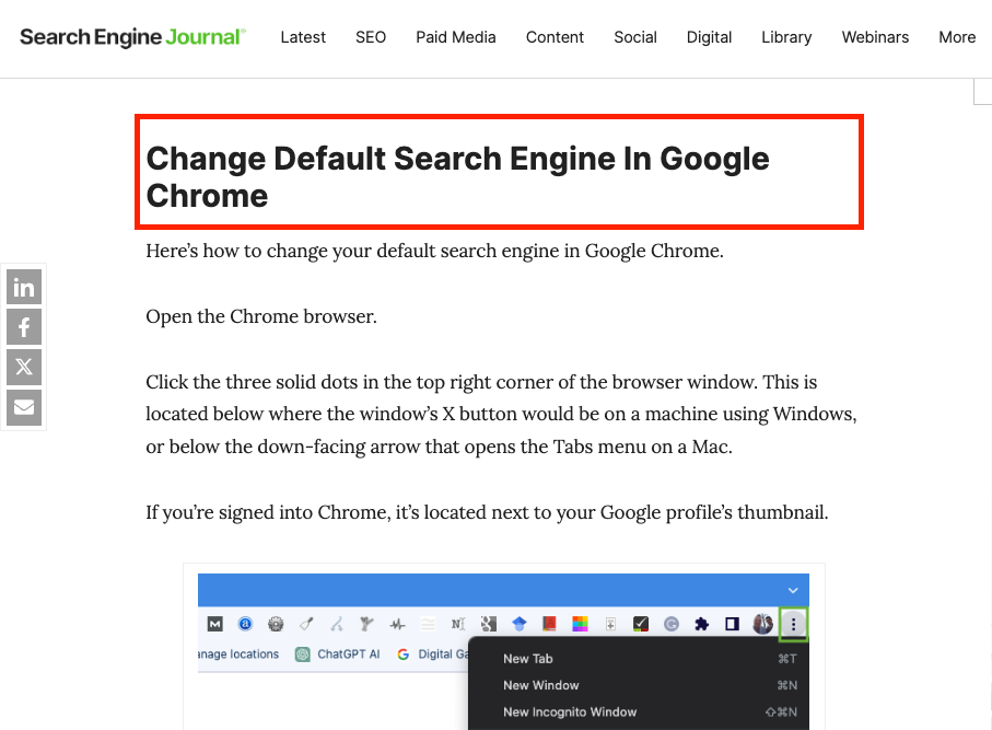 As an illustration, Search Engine Journal clinched the featured snippet for “How to remove default search engine in Chrome?” partially due to its H2 optimized with relevant keywords: